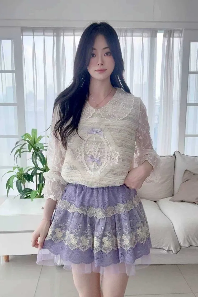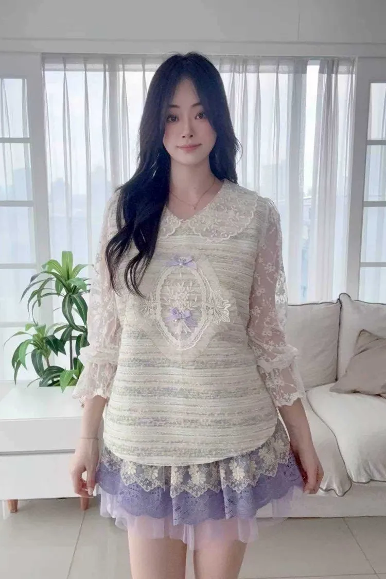 🔥現貨🔥MS026 🇰🇷正韓🌺甜美名媛拼接蕾絲袖亮麗小香風上衣🌺