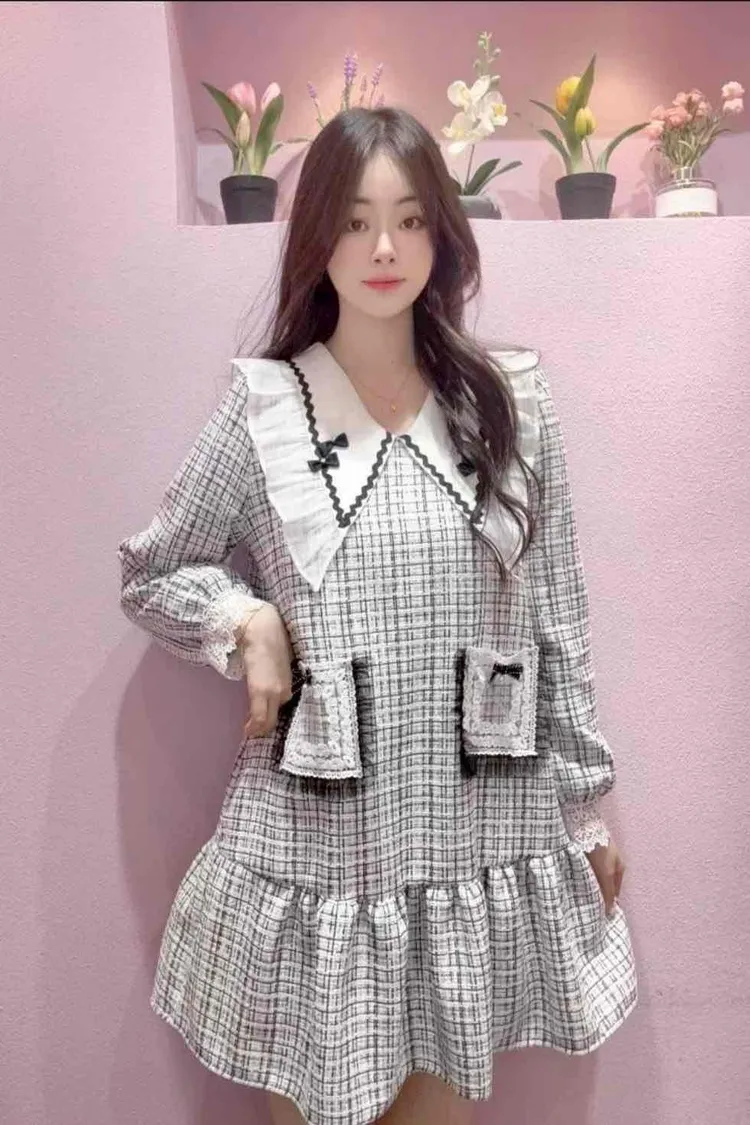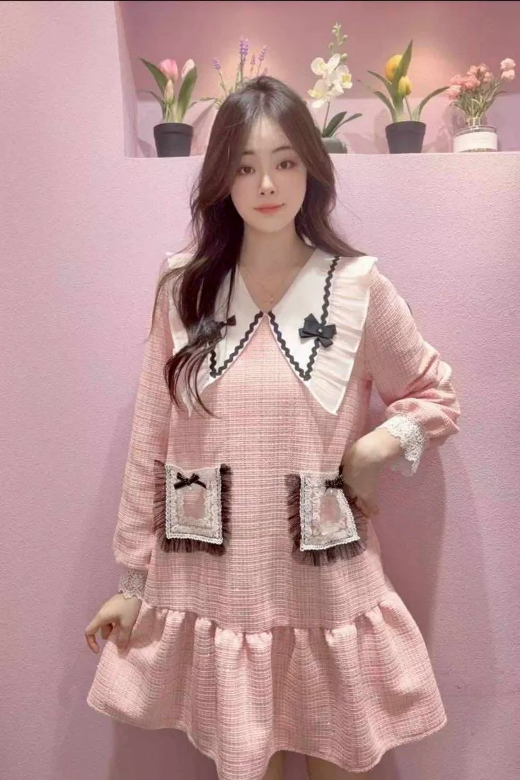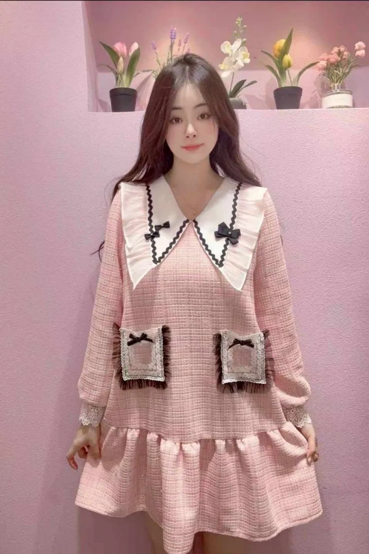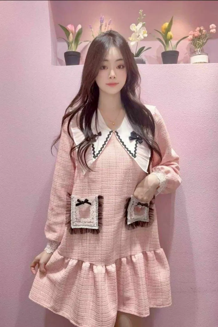 🇰🇷正韓🌺小香風娃娃領洋裝🌺💎 夢幻大翻領設計:搭配蝴蝶結點綴,臉型更顯小,俏皮又優雅。 🌸 立體蕾絲口袋+蝴蝶結裝飾:細節滿分,隨手一動都散發精緻感。 💃 裙襬荷葉層次:走動之間輕盈飄逸,少女浪漫氛圍滿分。