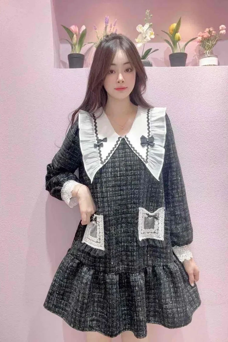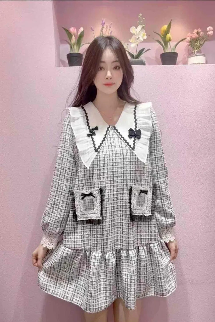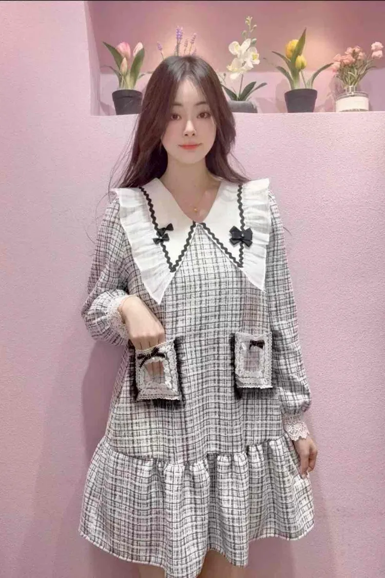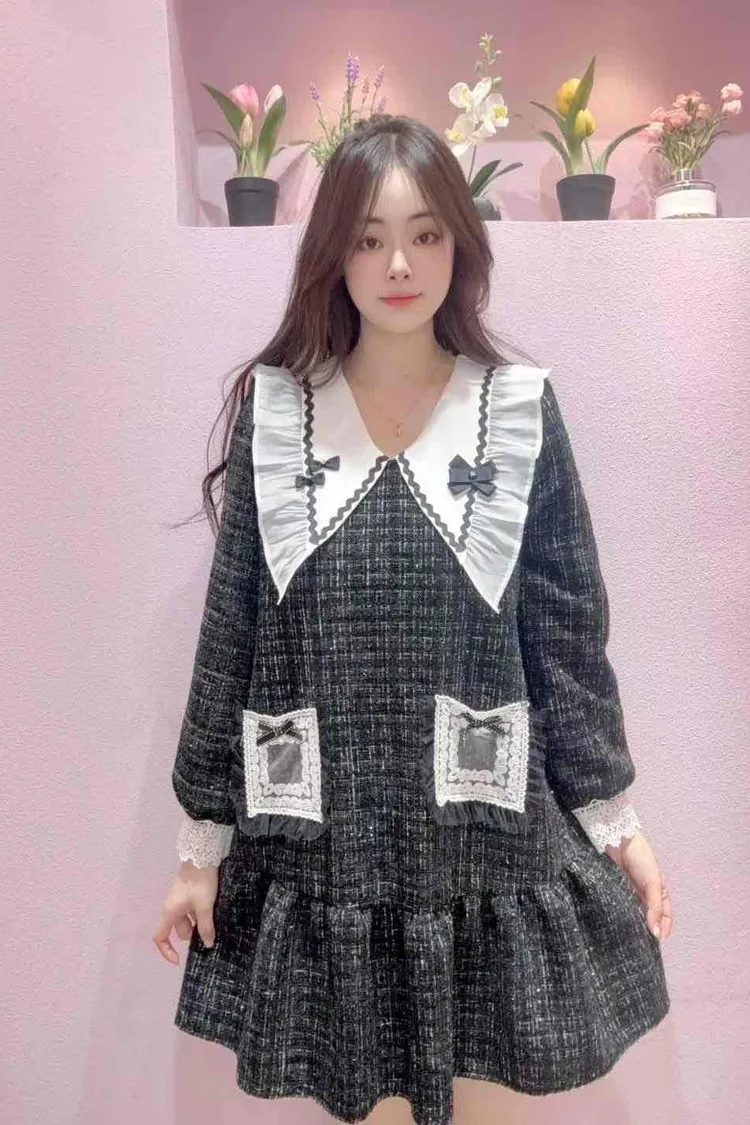 🇰🇷正韓🌺小香風娃娃領洋裝🌺💎 夢幻大翻領設計:搭配蝴蝶結點綴,臉型更顯小,俏皮又優雅。 🌸 立體蕾絲口袋+蝴蝶結裝飾:細節滿分,隨手一動都散發精緻感。 💃 裙襬荷葉層次:走動之間輕盈飄逸,少女浪漫氛圍滿分。