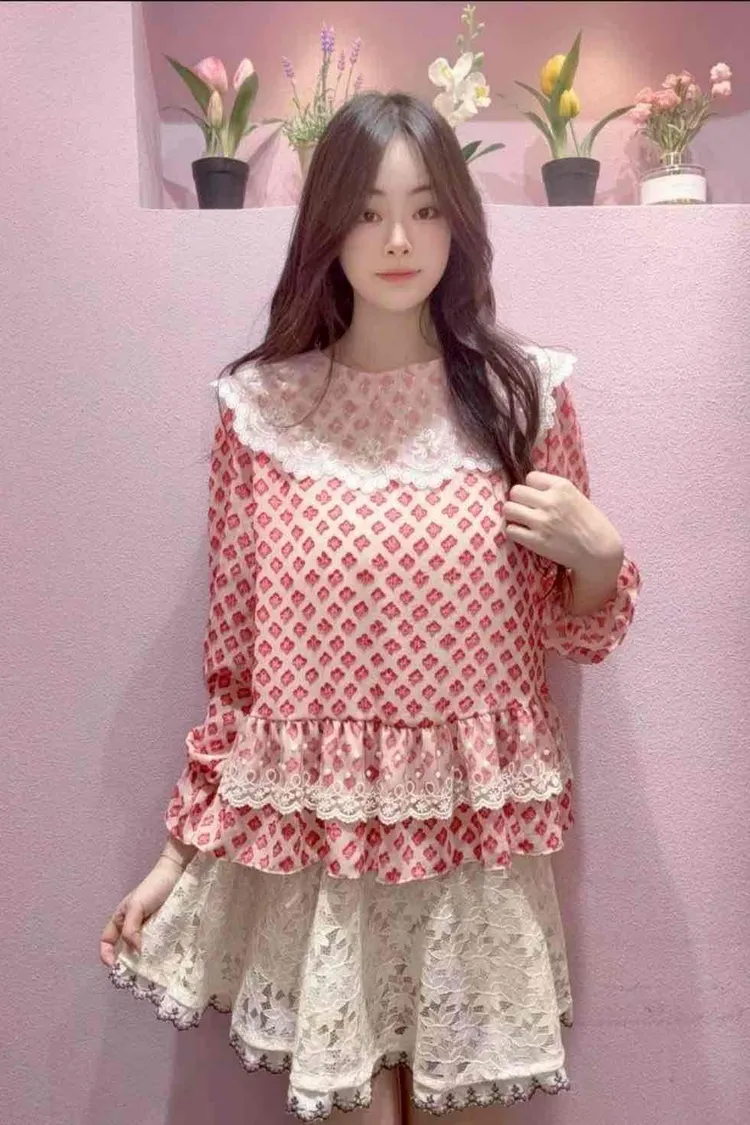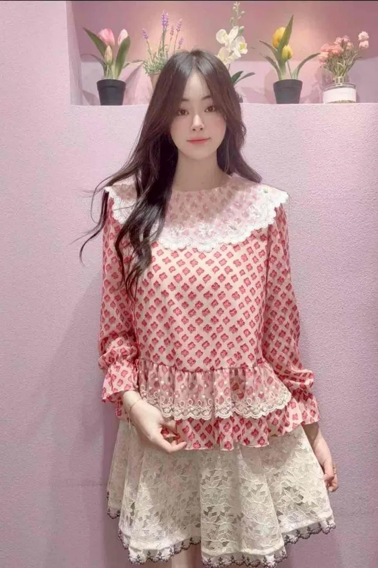 🔥現貨🔥MS051 🇰🇷正韓🌺甜美復古蕾絲娃娃領印花上衣🌺