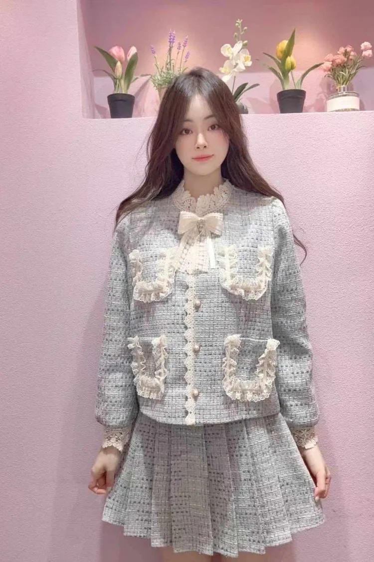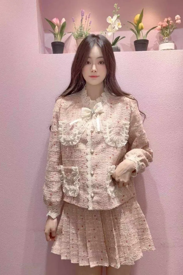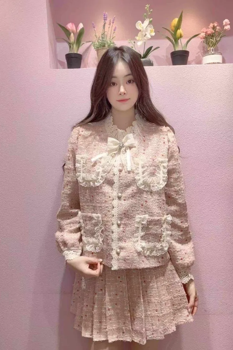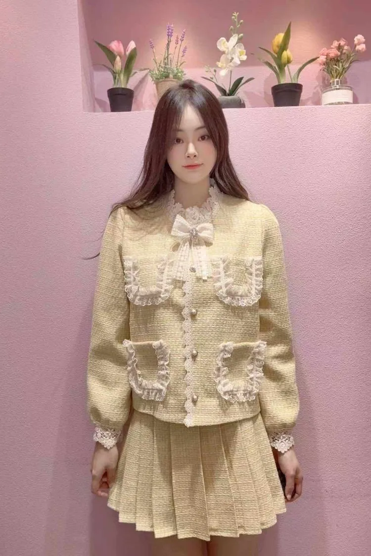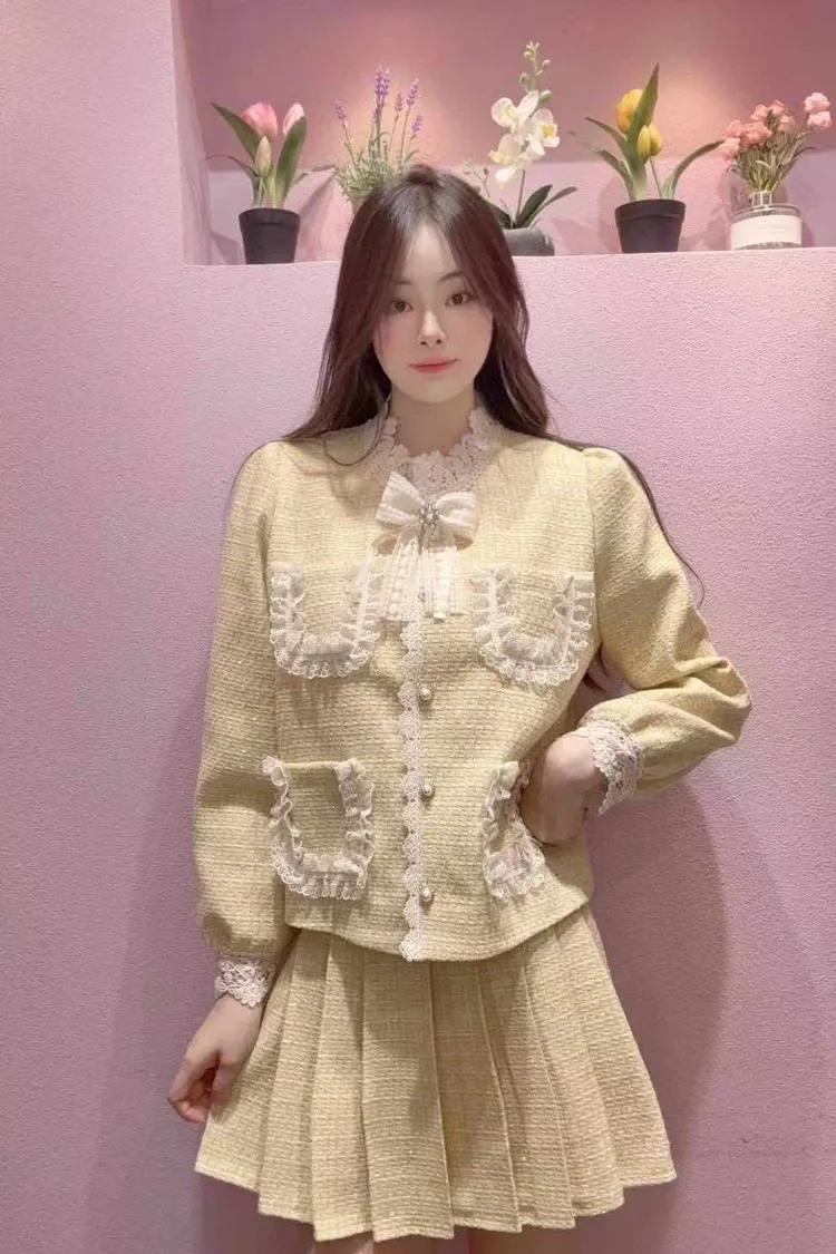🇰🇷正韓🌺名媛氣質款小香風蕾絲蝴蝶結外套+短裙套裝🌺