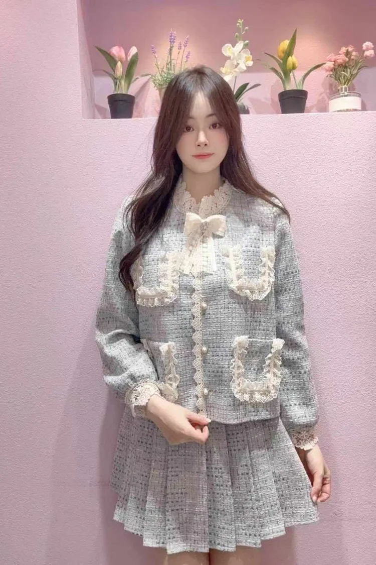 🔥現貨🔥MS056 🇰🇷正韓🌺名媛氣質款小香風蕾絲蝴蝶結外套+短裙套裝🌺