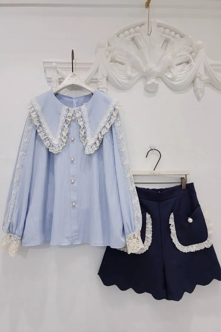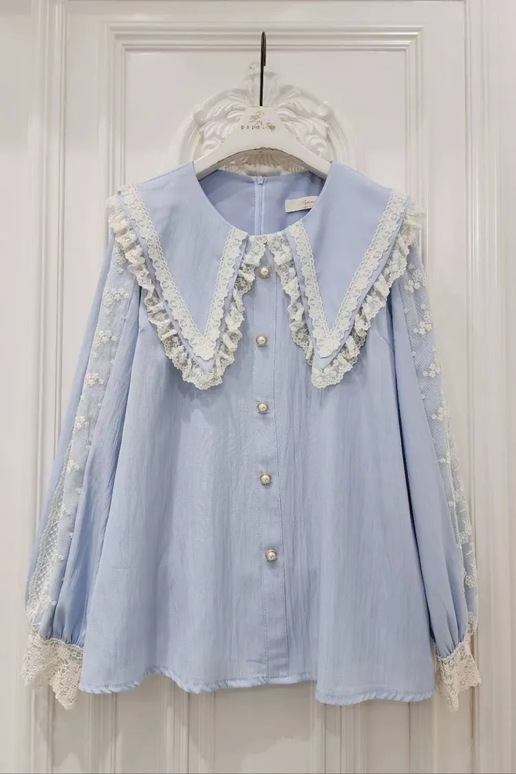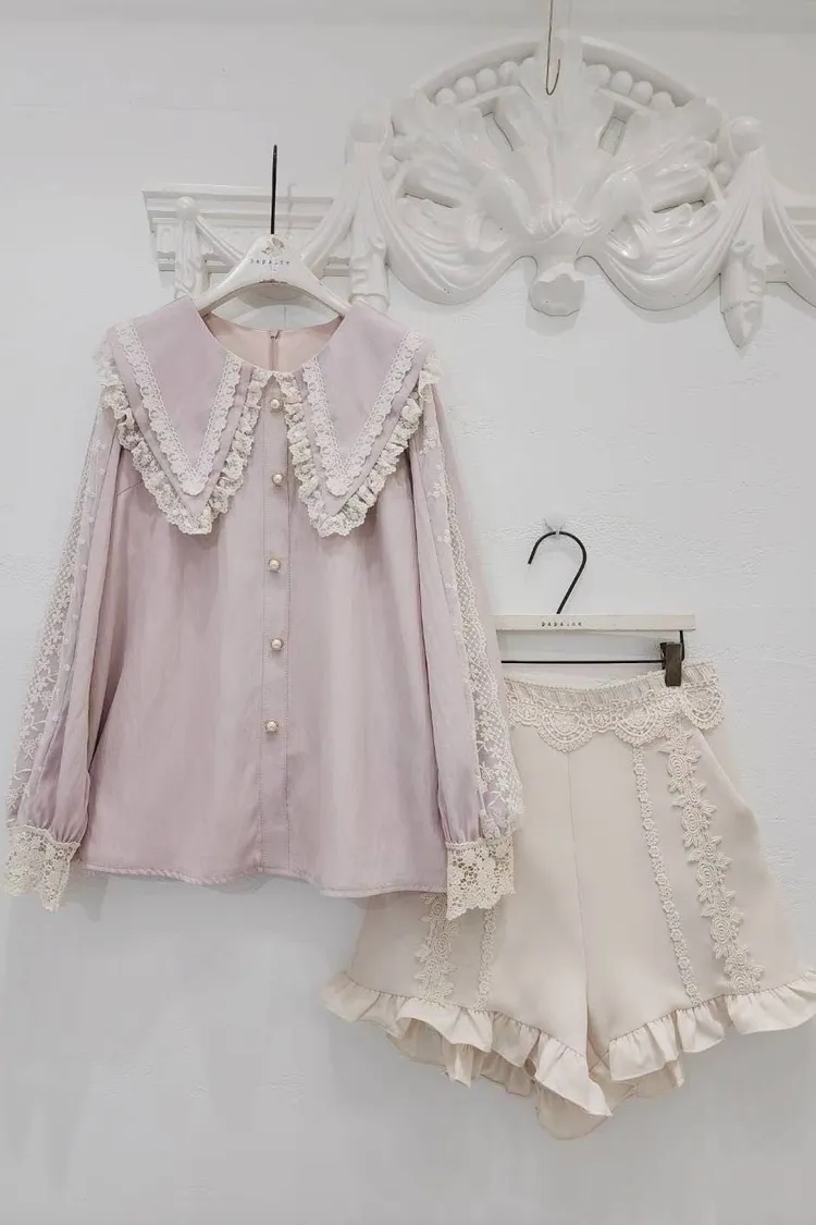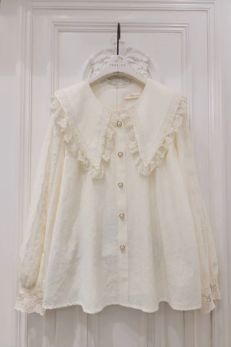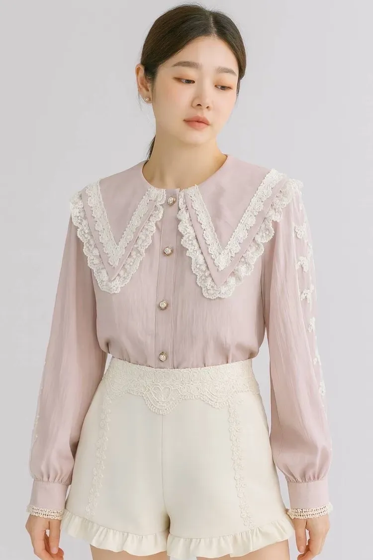 🔥現貨🔥PA043 🇰🇷正韓_PaPa🎀精緻蕾絲滾邊大翻領珍珠釦上衣🎀