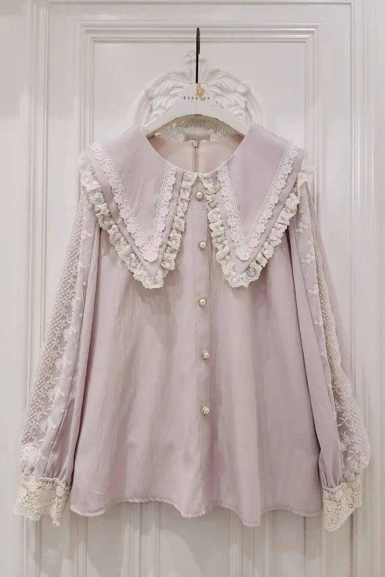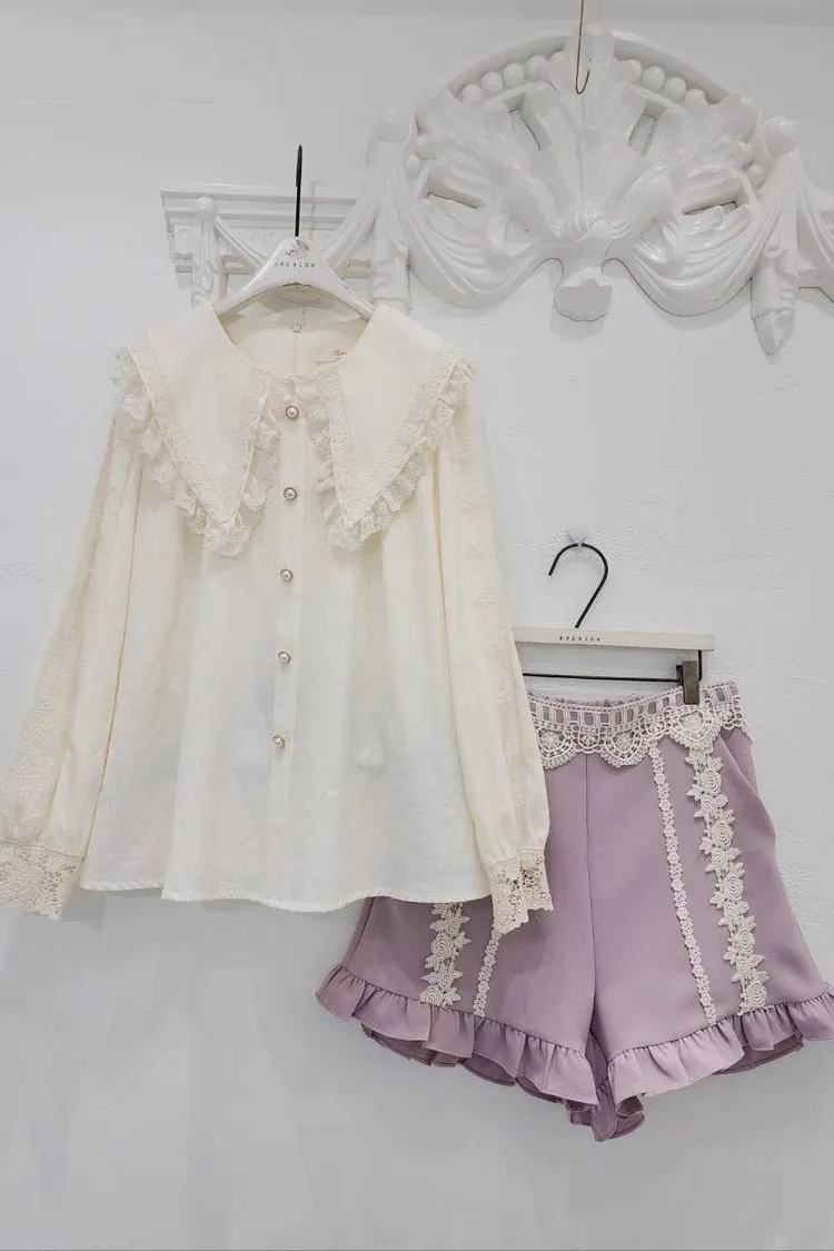 🎀精緻蕾絲滾邊大翻領珍珠釦上衣🎀