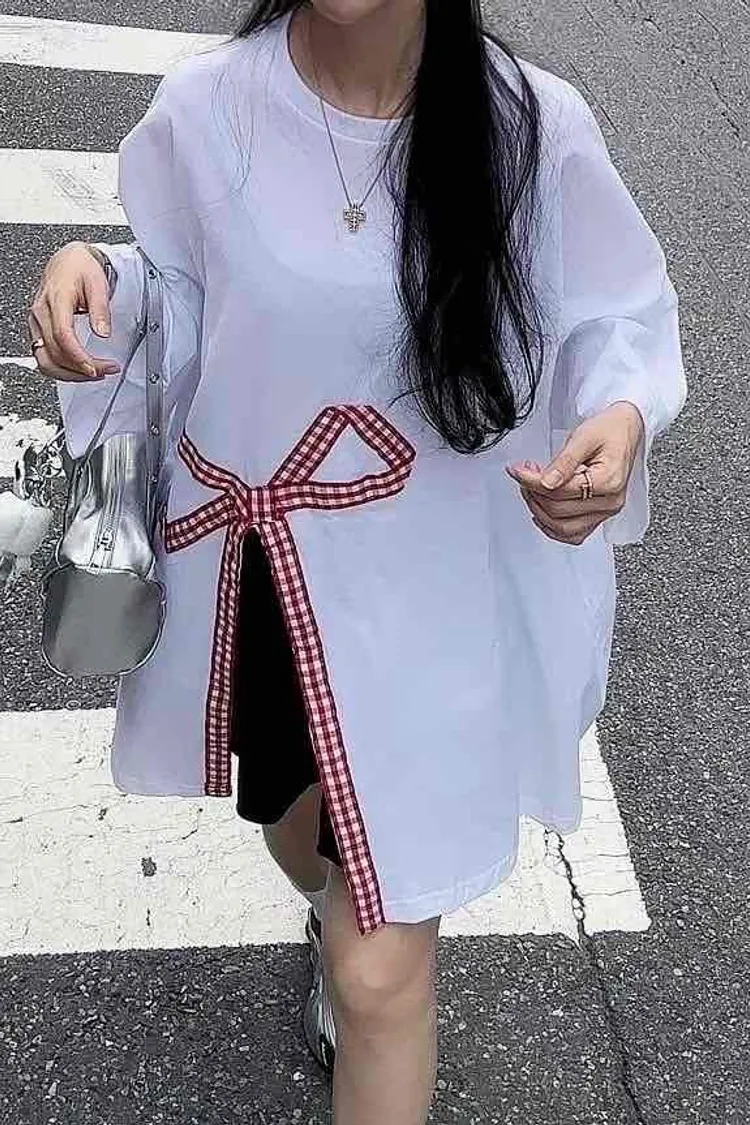 💜甜美韓系側邊格紋蝴蝶結休閒上衣💜