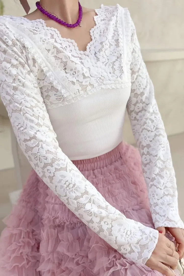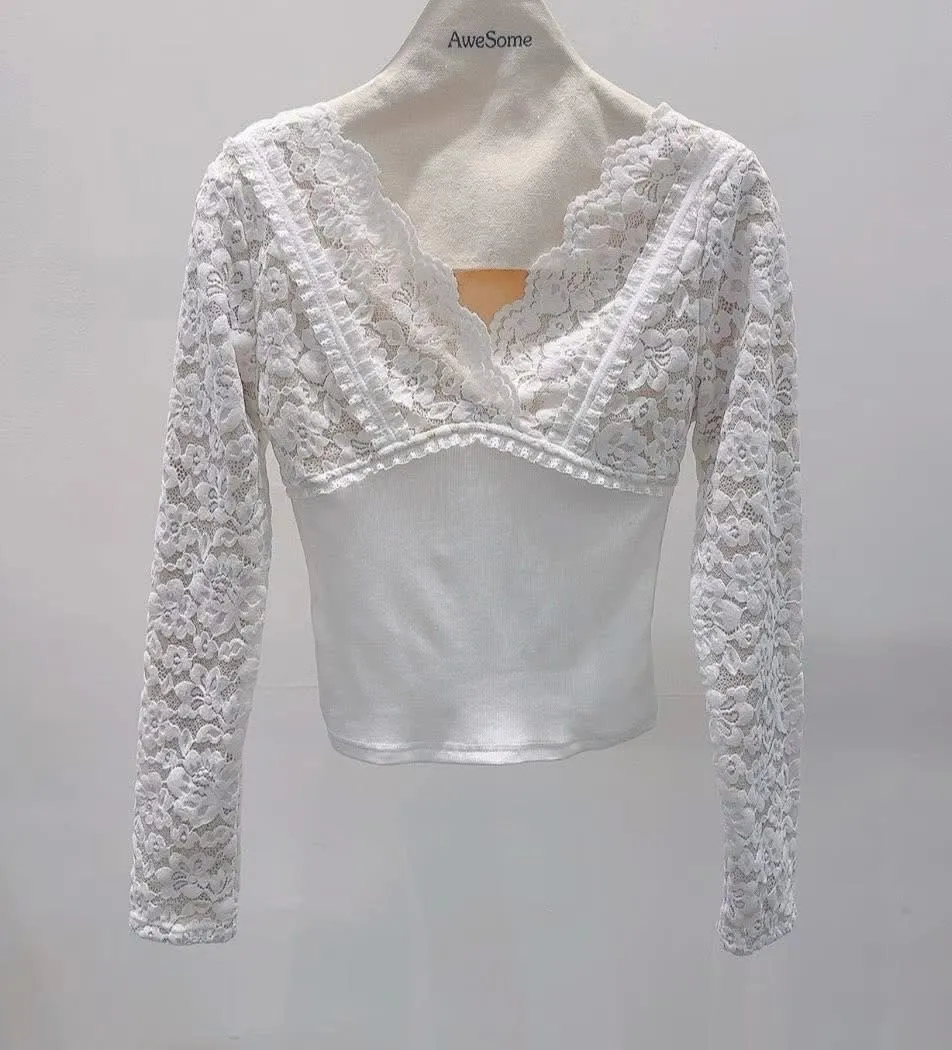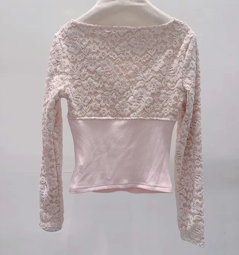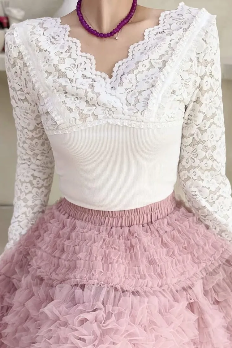 YA017 🇰🇷正韓🌹法式復古蕾絲V領拼接修身羅紋針織上衣(白/粉)